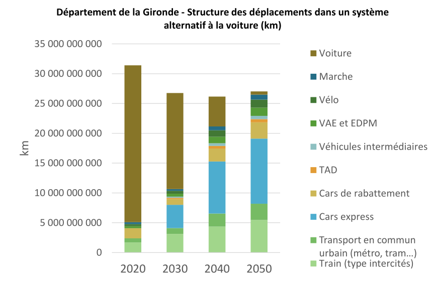 Le graphique joint extrait des documents de BL Evolution montre la réduction de kilomètres parcourus et le report modal attendus pour la Gironde. Sans surprise celui-ci va essentiellement vers les TC.